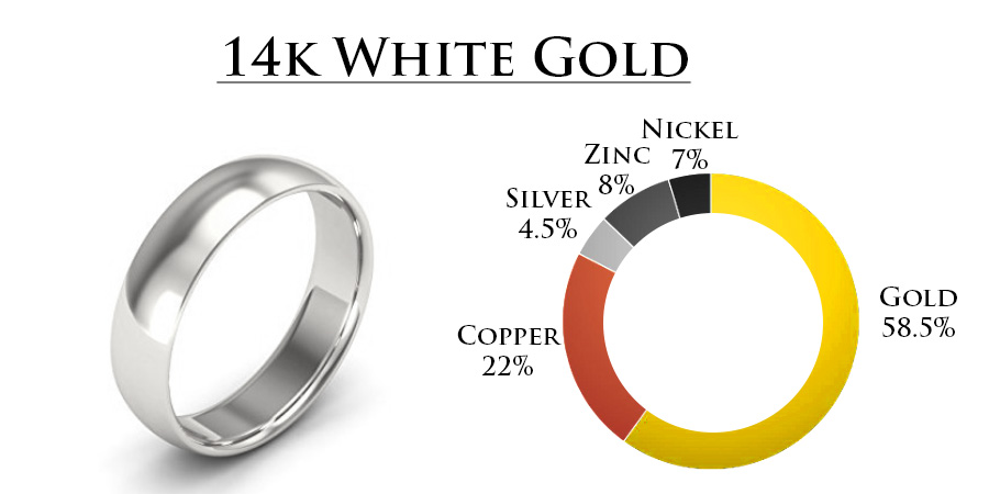 So how about white gold? White gold is almost a misnomer, considering it is still a pale yellow. At the end of the day, we’re still working with gold, which is a dark yellow. No matter how much white metal alloy you add, you are still going to end up with a very pale yellow color. Fourteen karat white gold is the standard, although it can also be made in 18 karat. Fourteen karat white gold is 58.5% gold, 22% copper, 7% nickel, 8% zinc, and 4.5% silver. Some people with significant nickel allergies may prefer to opt for a white gold alloy that uses some palladium (58.5% gold, 21% silver, 15.5% palladium 4% copper and 1% zinc). Some alloys also may do without any copper by adding more palladium, although adding more palladium makes the gold harder and more difficult to work with. However, there is another important consideration with regard to white gold: rhodium. Rhodium is an extremely expensive, bright white metal that is electroplated onto white gold jewelry to give the white gold that bright and shiny white look that we expect. Rhodium is hypoallergenic, so even if someone is sensitive to nickel, there generally isn’t a need to buy the nickel-free white gold alloy. Just make sure you keep your plating in good condition. Expect to have your rhodium plating redone every six to 12 months, depending on the wear and tear your jewelry takes.