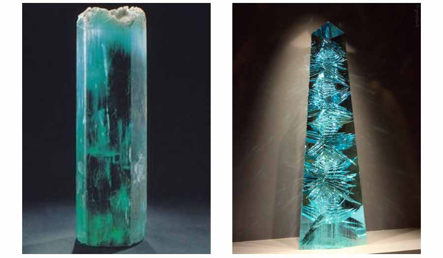 The Dom Pedro Aquamarine (L) before and (R) after being cut