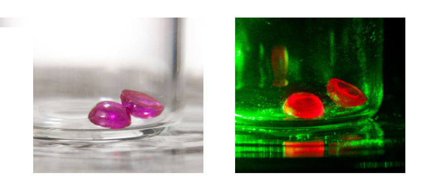A ruby under normal lighting (left) and under UV lighting (right) displaying its florescent properties