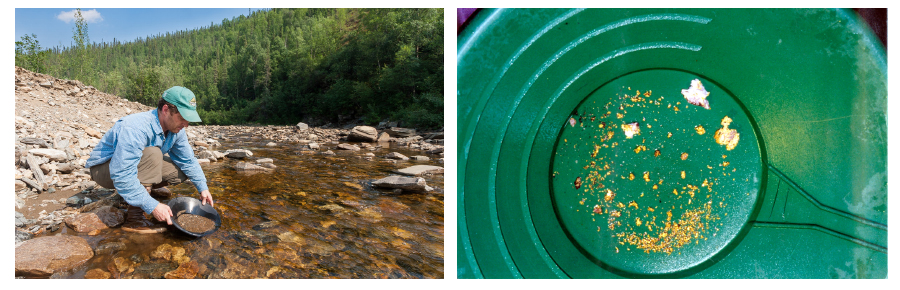 (L) A miner panning for gold and (R) gold successfully extracted from the paydirt